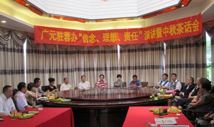 2011年9月8日,广元市人民政府驻成都办事处在位于温江的金色庄园开展了“坚定信念、放飞理想、勇担责任”演讲暨中秋茶话会。参加会议的有市政府副秘书长、办事处主任常晓梅,副主任闫筑、全体职工及退休老职工计35人。