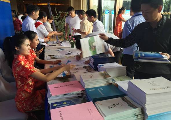 (图为参会企业家在会场签到处领取广元市招商引资资料)