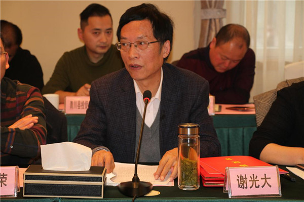 (图为:原四川省工商联副主席、省人民政府参事室特约参事研究员、广元市政府委托招商顾问谢光大做交流发言)