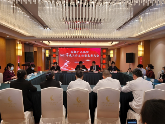 2022年1月20日,成都广元宾馆组织召开2021年度工作总结暨表彰大会。负责联系成都广元宾馆工作的赵耀同志出席会议并讲话,宾馆总经理郑庆国、各部门负责人及全体员工参加会议。会上全面总结了2021年度工作,并表彰了优秀管理人员及员工。会议由副总经理常莉云主持。