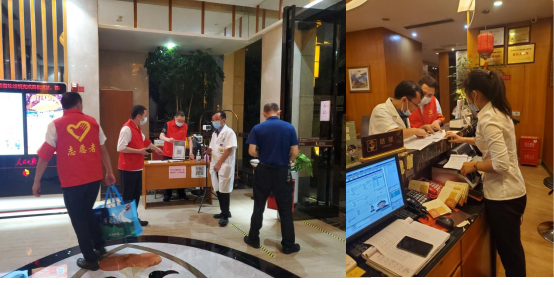 “我是共产党员,在疫情防控的关键时期,能够成为党员志愿者党支部的一员,为防疫工作人员服务,我很自豪。他们是疫情防控的逆行者,我就应该做好服务保障工作。”负责在宾馆卡口测温、扫描场所码的唐加华说。