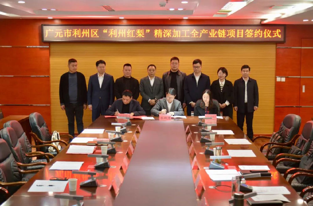 签约仪式上,利州区副区长向庚代表区人民政府分别与“利州红梨”精深加工全产业链项目、鑫浪麟食品加工项目负责人签订协议。