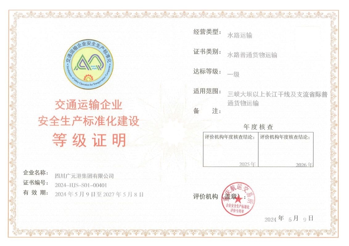 2019年,广元港集团获得交通部授权的重庆航运交易所颁发的水路运输安全生产标准化“一级”达标证书,该证书每三年由具有审验资质的三方机构审核换证。