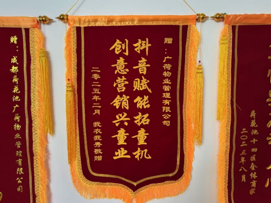 近日,一面写着“抖音赋能拓童机,创意营销兴童业”的锦旗送到了广荷物业,这是来自十四区一楼童装店“我衣我秀”经营业主对广荷物业协助其打造IP账号的诚挚感谢。