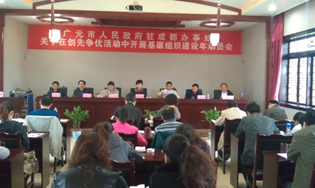 2012年4月17日,市政府副秘书长、办事处主任、成都招商分局局长常晓梅在郫县农科村刘氏山庄三楼会议室主持召开了广元办事处党支部基层组织建设年活动动员会。办事处全体在职干部职工及退休党员35人参加了会议。会上,常副秘书长传达了“中共四川省省直机关事务管理局市州人民政府驻蓉办事处管理处委员会关于在创先争优活动中开展基层组织建设年”会议精神;全体干部职工学习了 “广元办事处关于在创先争优活动中开展基层组织建设年的实施方案”;根据“省直机关事务管理局基层党组织现状大调查实施三分类三升级活动实施意见”精神,全体干部职工填写了《基层党组织情况调查问券》。常副秘书长在会上从思想上再重视、行动上再加强,措施上再细化、力度上再加大,工作结合上再研究、体现成效上再给力三个方面作了动员讲话。之后对各科室近期工作进行了详细安排部署。会后全体干部职工共同参加了绿道踏春骑游、乒乓球、羽毛球等体育活动。