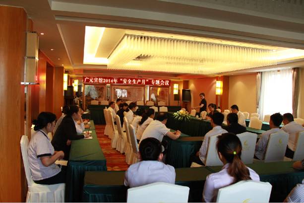 “安全责任、重在落实”——今年六月是我国第十三个安全生产月。成都广元宾馆积极响应上级号召,5月28日,宾馆总经理蒋小俊组织全体员工召开了安全生产月专题会议,部署具体活动、宣传内容,并组织学习培训、如应急演练,对全体员工进行安全生产教育,同时要求配合监理单位加强监管力度,对现场存在的安全隐患积极整改落实。会上还传达了营门口街道办《关于2014年“安全生产月”活动方案的通知》〔2014〕73号文件精神。