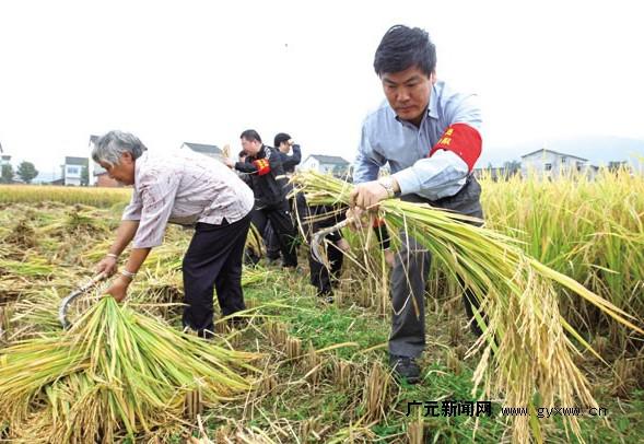 罗强与市直机关共产党员志愿者服务队队员在赤化镇帮助老人抢收水稻