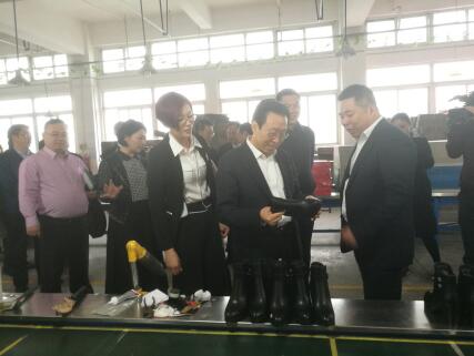 (图为:王菲一行在钱昭迪的陪同下参观制鞋生产车间)