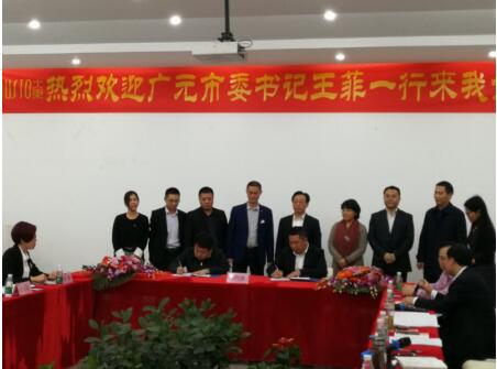 (图为:王菲书记和市、县领导与公司高层见证苍溪县副县长任云与公司总经理钱昭迪签订产业转移项目框架协议书)