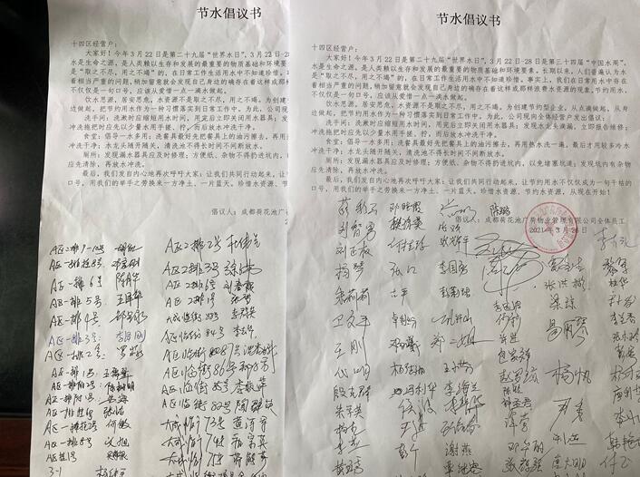 经营户还在《节水倡议书》上签名,承诺“珍惜水资源、节约水资源,从现在开始。”