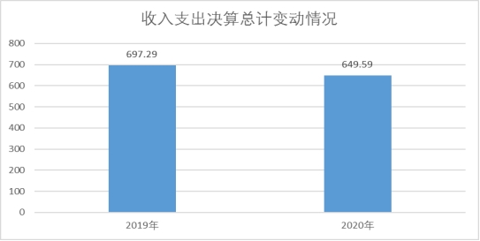 2020年度收、支总计649.59万元。与2019年相比,收、支总计减少47.7万元,下降6.84%。主要变动原因:一是人员减少;二是严格落实过“紧日子”要求,压减机关工作经费,降低机关运行成本。