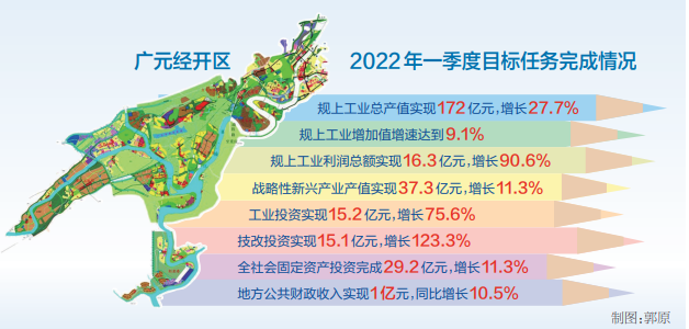 30年来的上升曲线,在这个春天同样华丽精彩:一季度,广元经开区规上工业总产值实现172亿元,增长27.7%;规上工业增加值增速达到9.1%;规上工业利润总额实现16.3亿元,增长90.6%;战略性新兴产业产值实现37.3亿元,增长11.3%;工业投资实现15.2亿元,增长75.6%;技改投资实现15.1亿元,增长123.3%;全社会固定资产投资完成29.2亿元,增长11.3%;地方公共财政收入实现1亿元,同比增长10.5%,均超额完成一季度目标任务。