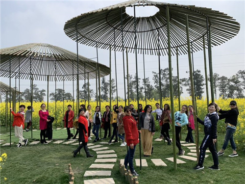 竹艺村参观结束后,大家在竹艺村旁油菜花田金黄色的热浪中寻找春意拍照留念。