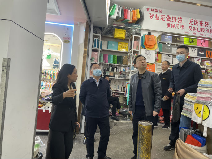 杨海生一行实地走访了荷花池第十四交易区、大成市场、宏正市场等服装经营场所,现场了解了荷花池第十四交易区的基本情况、运营模式和存在困难。